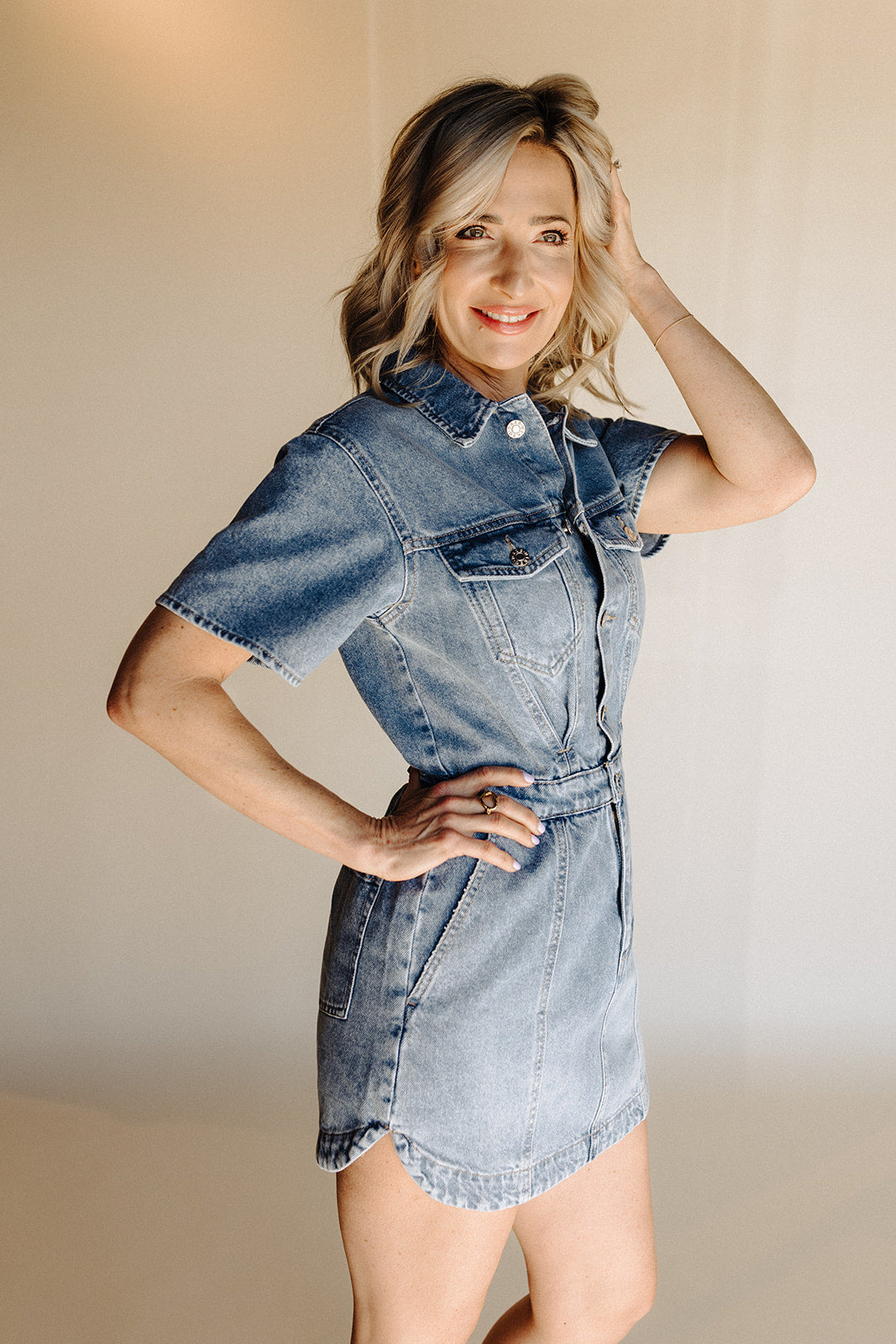 An easy denim dress designed for everyday wear. Featuring a structured yet comfortable fit, short sleeves, and a button-front silhouette, this piece blends classic denim with a feminine shape. The defined waist and soft drape make it flattering, versatile, and effortless to style.